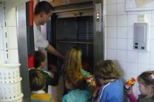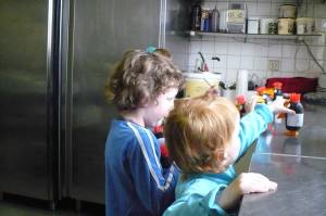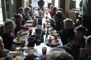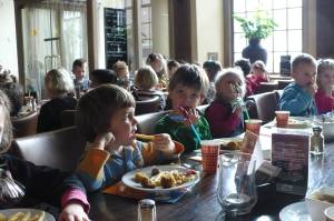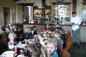 Vol enthousiasme vertelden de kleuters dat zij écht niet iedere dag zo deftig overbleven met hun school. In de klas is een keukenhoek, waar ze van alles leren over eten en drinken enzo. Maar de échte praktijk, netjes aan tafel blijven, netjes eten, dat leerden ze nu. Meehelpen in de keuken mocht ook, spannend! En de rekening? Die werd gesponsord door Het Oude Stadhuis!