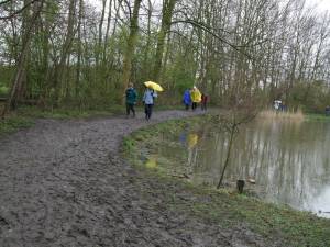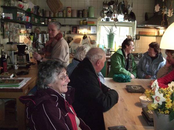 Een foutje van het KNMI en het slechte weer van de afgelopen weken en zorgde voor een natte, modderige wandeling. Dat kon echter de stemming niet drukken, want het werd opnieuw een gezellige wandeling. Aan het einde konden ze nog even aanschuiven bij een boerin aan de keukentafel om nog na te genieten van onze mooie tocht.