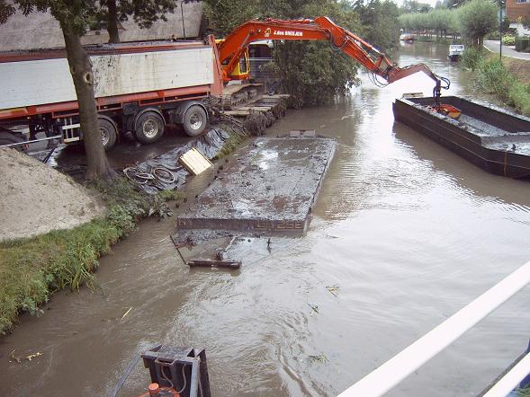 Menigeen staat vanaf de kant het baggeren te bekijken.
