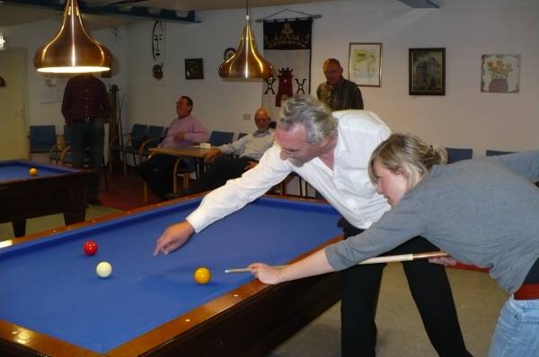 Piet van de Zande gaf haar les, onderbroken door enthousiast commentaar van de aanwezige biljarters.