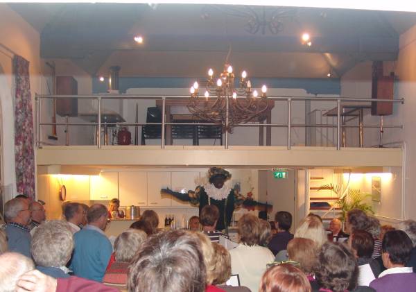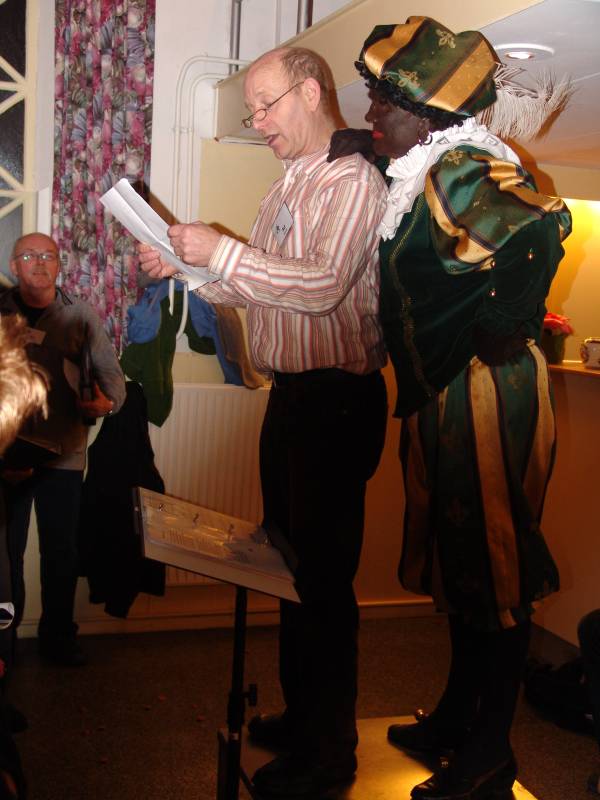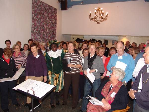 Dirigent Ad Pronk was net heel serieus bezig om met zijn koorleden een nieuwe smartlap in te studeren: "Het broekie van Jantje," toen er hard op de deur werd gebonsd en in een regenbui van pepernoten Zwarte Piet binnenkwam.