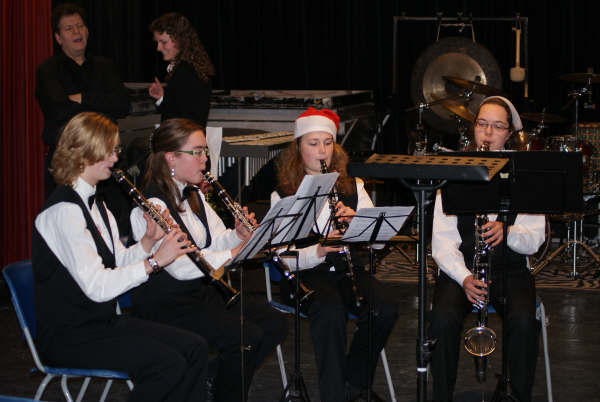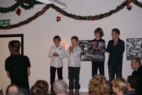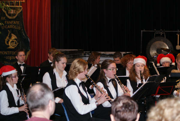 In het eerste gedeelte lieten deze leerlingen aan hun ouders en familie en medemuzikanten, horen hoe zij gevorderd zijn in het afgelopen jaar. Veel sfeervolle muziekstukjes in kleine of grotere groepjes. Na een korte pauze speelde de harmonie van Sint Carolus o.l. van dirigent John Brouwer een aantal mooie en vrolijke kerstnummers. De kerstnummers, gespeeld door het harmonieorkest, werden afgewisseld door een drietal optredens van de dwarsfluitgroep, klarinetensemble en slagwerkleerlingen. Vooral de slagwerkers met Patrick oogsten veel bewondering door een spannend stukje ritmisch klapwerk samen met 2 drumstellen. 4 jonge aankomende slagwerkers op de tafel aan de ene kant van de zaal, 2 drummers aan de andere kant, en daartussen een enthousiaste docent die het geheel strak liet klinken. De zaal hield de adem in en de groep kreeg na afloop een daverend applaus.