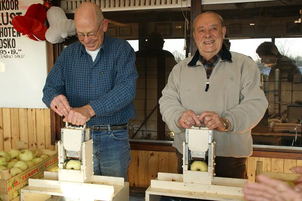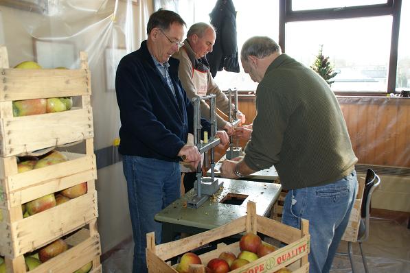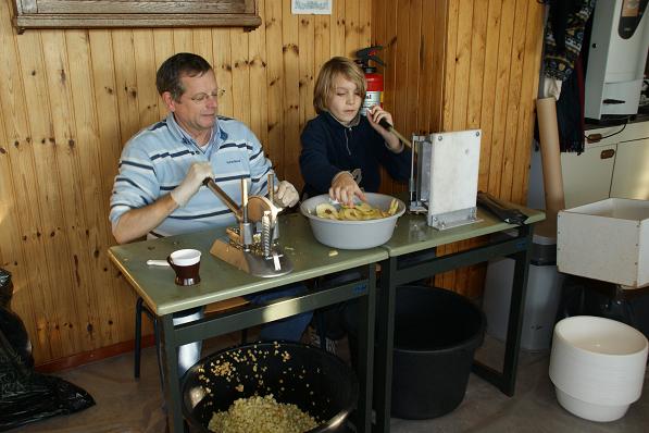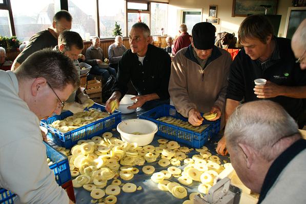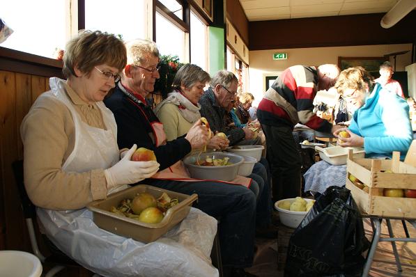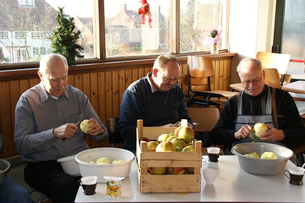 Geplaatst op:27-12-2008 Bijgewerkt op:27-12-2008 17:23 Mannenkoor treft voorbereidingenBron: Saskia van den Brink, RSMZaterdag 27 december was het een gezellige drukte in de kantine van de houthandel in Linschoten. Leden van het mannenkoor Zanglust en enkele familieleden offerden hun vrije middag op om zo'n 700 kilo appels te schillen. Hier worden uiteindelijk zo'n tien- tot twaalfduizend appelflappen van gemaakt. Dit als voorbereiding op oudejaarsdag. Als vanouds kunnen de inwoners van Linschoten en omstreken op 31 december vanaf 8.30 uur tot 13.00 uur overheerlijke oliebollen en appelflappen kopen (zolang de voorraad strekt) bij de kramen in de brandweergarage, en voor de supermarkt. De vroege vogels kunnen vanaf 03.30 uur al terecht bij de apparatenfabriek aan de Laan van Overvliet. Eerst het klokhuis verwijderen. Zij hebben nog wel een appeltje te schillen. Er wordt wel zo'n 700 kilo aan appels verwerkt. Wij snijden de appels in 4 of 5 schijven, en daarna worden ze in kratten startklaar gezet. Er zijn ongeveer 40 vrijwilligers actief om van deze appels zo'n 10.000 tot 12.000 mooie appelflappen te maken. Wat overblijft wordt verwerkt in kleine blokjes appel.