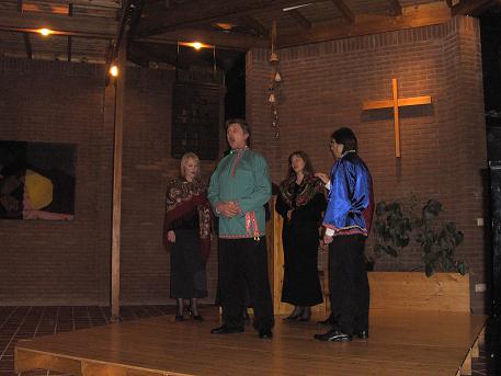 Geplaatst op:10-01-2009 Bijgewerkt op:10-01-2009 11:08 Neva Ensemble in LinschotenBron: Foto's Nel v.d. BrinkVrijdag 9 januari kwam het Neva Ensemble uit St. Petersburg naar het Kruispunt in Linschoten op uitnodiging van het mannenkoor ‘Zanglust’. Het concert bestond uit Slavisch-Byzantijnse muziek, opera, licht klassieke muziek en bekende Russische volksliederen. Zij zongen mooie Russische volksliederen Pianobegeleiding door Valerya Matygulina