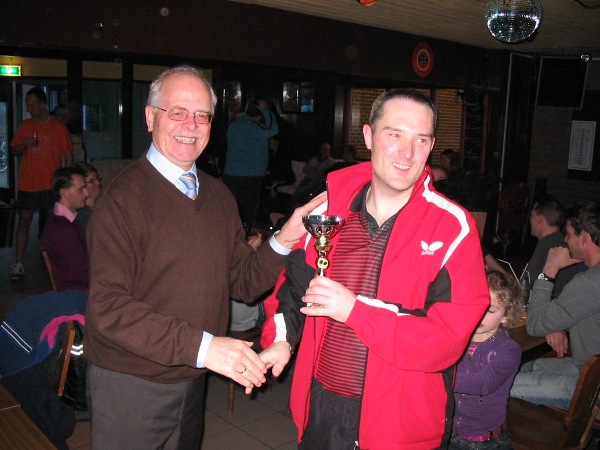 Geplaatst op:16-03-2009 Bijgewerkt op:16-03-2009 18:49 Open Montfoortse TafeltenniskampioenschappenZondag 15 maart waren de Open Montfoortse Tafeltenniskampioenschappen. Voor aanvang van de eerste wedstrijden was er de openingstoespraak van voorzitter Johan de Jong. Ook Nel Ott was hierbij aanwezig. Johan refereerde uiteraard aan Herman Ott, die jarenlang het gezicht was van de Open Montfoortse, als organisator. Daarbij terzijde gestaan door Nel Ott en Cor Tito. Helaas is Herman ons vorig jaar ontvallen. Er werd dan ook enige tijd stilte gehouden ter nagedachtenis aan Herman. Gelukkig werden er enige mensen bereid gevonden de omvangrijke organisatie op zich te nemen. Kampioen van de Open Montfoortse en dus kampioen van Montfoort werd, net als vorig jaar, Edwin Drayer van Woerden. De verenigingbeker, voor de succesvolste vereniging, werd dit jaar gewonnen door ZTTV uit Zeist. Voorzitter Johan de Jong opent het kampioenschap. .jpg) | Montfoorts Kampioen Edwin Drayer van Woerden ontvangt zijn prijs.