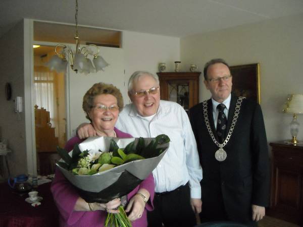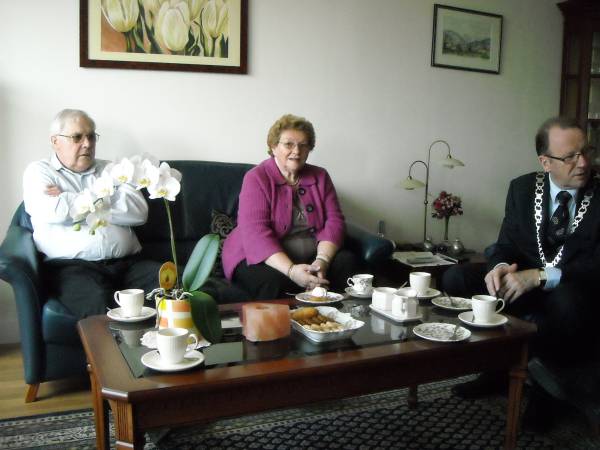 Het gouden paar werd donderdag door burgemeester Jansen van Montfoort in de bloemetjes gezet. De Burgemeester en de pers kregen een perfect, vers gemalen kopje koffie, mét gebak van Greet.