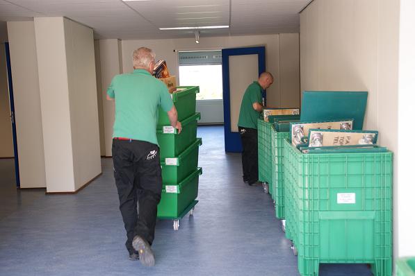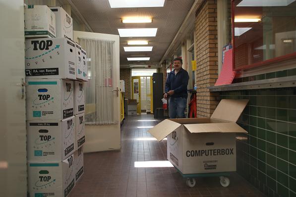 Dinsdag 21 april was het tijd voor de verhuizing van de Prins Clausschool naar het tijdelijke onderkomen aan de Jacob Barneveldstraat in Linschoten. Lege lokalen, overal volle verhuisdozen en het verhuisbedrijf dat heen en weer reed.