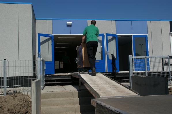 De schoolspullen worden het tijdelijke onderkomen in gereden.