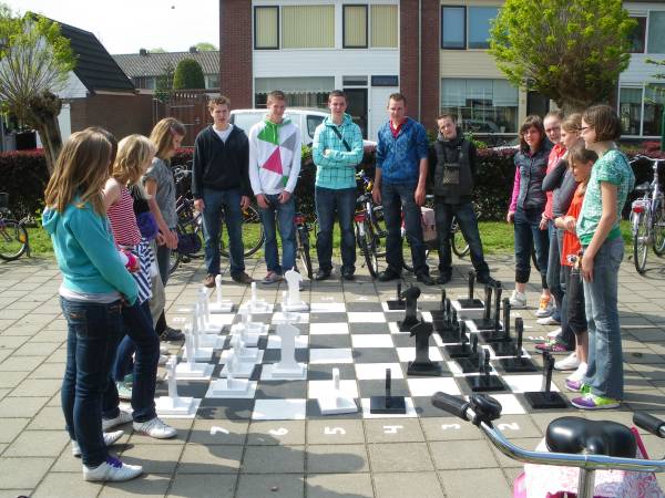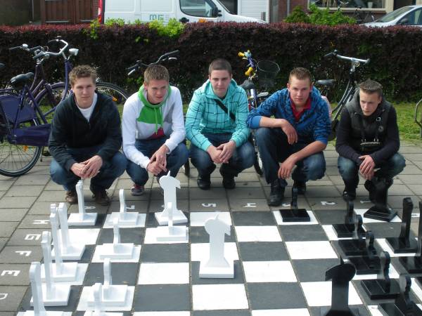 Geplaatst op:22-04-2009 Bijgewerkt op:23-04-2009 15:09 Groot schaakspel voor HeeswijkschoolBron: Ton van Rossum, Wellantcollege MontfoortVijf leerlingen van Wellantcollege VMBO Montfoort kregen enige tijd geleden het verzoek van de heer Ranft, locatieleider van de Heeswijkschool in Montfoort, een schaakspel te maken. Hiermee kunnen zijn leerlingen in pauze buiten schaken. Het moesten dus grote schaakstukken worden en het bord moest op het schoolplein geschilderd worden. Nadat de jongens de opdracht aanvaard en de taken verdeeld hadden, gingen ze aan de slag. Er moest berekend worden hoeveel hout ze nodig hadden. Ook moest er een begroting gemaakt worden. Deze begroting moest de goedkeuring van de opdrachtgever, de heer Ranft, krijgen. Toen dat in orde was, kon het hout besteld worden. Daarna kon het handwerk beginnen. Alle stukken uittekenen op het hout, de stukken zagen, daarna goed schuren, alles in elkaar zetten en tot slot verven.