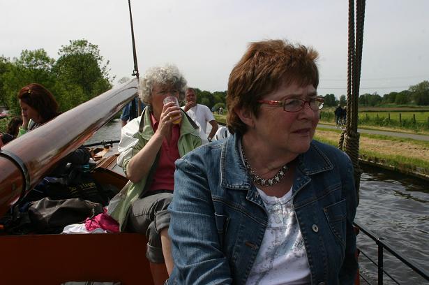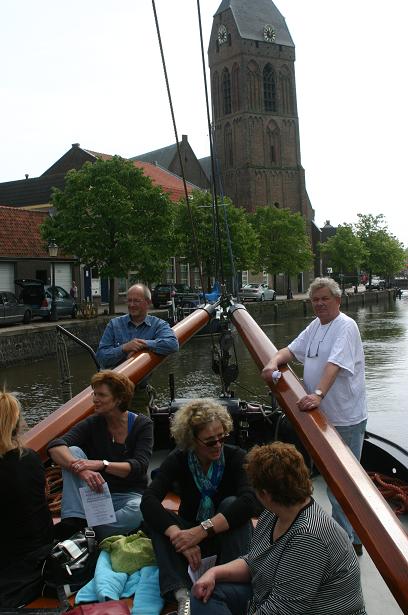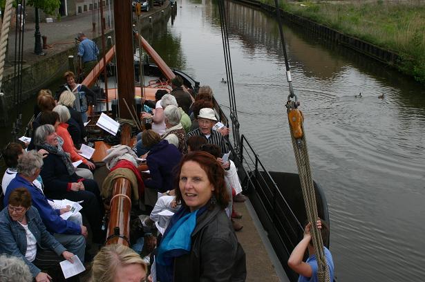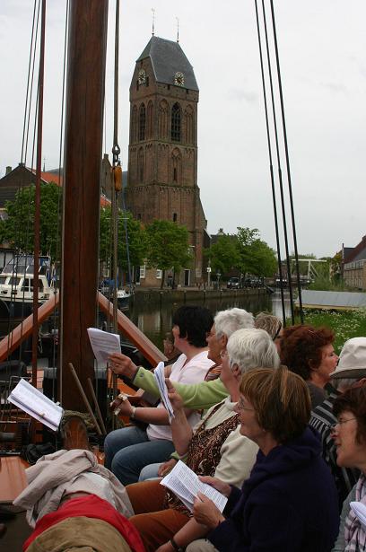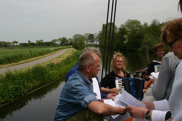 Geplaatst op:10-05-2009 Bijgewerkt op:10-05-2009 08:50 Zingende Zaterdag op de Hollandse IJsselMet het achter zich laten van het stadje Oudewater met zijn silhouet van de karakteristieke toren van de St. Michaëlskerk begon voor de deelnemers aan de Zingende Zaterdag een prachtige vaartocht over de Hollandse IJssel naar Gouda en terug. Schitterend weer en een kopje koffie of thee met een lekker gebakje zorgde gelijk al voor een gezellige sfeer. De gasten van de ZangZaak hadden plezier in het met elkaar zingen en maakten er onder leiding van Monique van den Hoogen een geweldige middag van op het dek van “den Onthaestingh”. Deze in 1912 gebouwde ijsselaak, met als thuishaven de Noord-IJsselkade in Oudewater is speciaal voor het varen op de Hollandse IJssel gebouwd, want bij het schutten in de Waaijersluis wordt van schipper Wim Brunt van de 20 x 4 meter metende aak de nodige stuurmanskunst gevraagd, maar de afmetingen zijn precies op maat om de sluis ongehinderd te passeren. Op de tocht naar Gouda toe werd er gestudeerd op het wat minder eenvoudige repertoire over de verschillende facetten van het thema “water”, maar op de terugreis kwamen de echte meezingers aan bod, waarbij de begeleiding in handen was Janet van Diest en Hilde Hegeman die met veel plezier het gelegenheidskoor op de accordeon begeleidden. Monique gaf aan verschillende liedjes ondersteuning op de gitaar. Met een lekker drankje en een heerlijk broodje zalm of paling werd er ook goed voor de inwendige mens gezorgd.