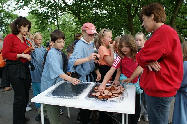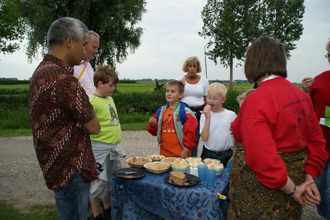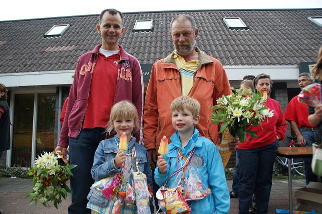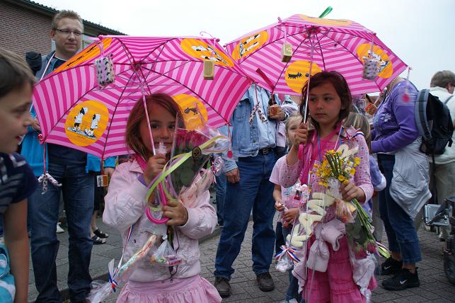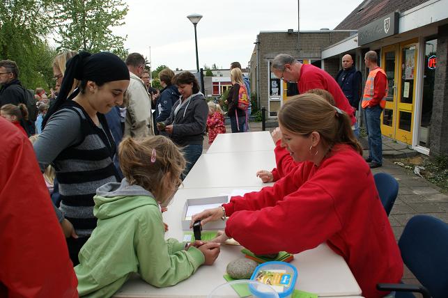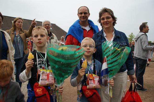 Op de eerste avond, de Linschoterbosroute, liepen er zo'n 350 deelnemers mee. Van jong tot oud, met een vereniging of met buurtbewoners, maar ook een groep rolstoelers onder begeleiding van enthousiaste vrijwilligers van het Rode Kruis deden weer mee. De Linschoterbosroute. Het Rode Kruis liep/ rolde ook weer mee. Op naar de laatste stempelpost. Nog steeds vrolijk na al die kilometers. De eerste avond zit er weer op, de laatste stempel wordt op de kaart gezet. De tweede avond was de Weideroute. Met z'n allen over het fietspad richting de Lage Kade. En via de Cattenbroekerdijk weer terug naar de Vaart. De derde avond was de Rivierenroute. Deze avond kwam de inwendige loper niets tekort. Lekkere worst en spekkoek stond voor de lopers klaar. Op donderdag werd de Finaleroute gelopen. Om 20.00 uur verzamelden de lopers zich op de Strick van Linschotenstraat voor het defilé, waar zij werden opgewacht door familie en vrienden. Zo ook deze twee vrolijk uitgedoste meiden. Onder begeleiding van muziekvereniging Linfano vertrokken de lopers richting De Vaart. Eenmaal aangekomen bij De Vaart speelde muziekvereniging Linfano nog een paar gezellige nummers terwijl de medailles werden uitgereikt. Deze jonge deelnemers hebben hun medailles opgehaald en genieten nog even van het ijsje wat ze aangeboden kregen. Prachtig wandelweer, de grote inzet van vele vrijwilligers en de bijdrage van de vele sponsors maakten de Avondvierdaagse van Linschoten weer tot een groot succes!