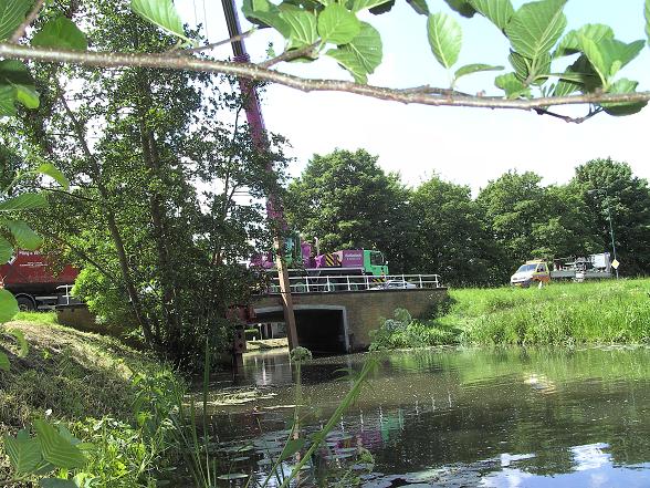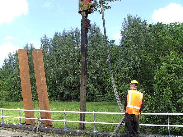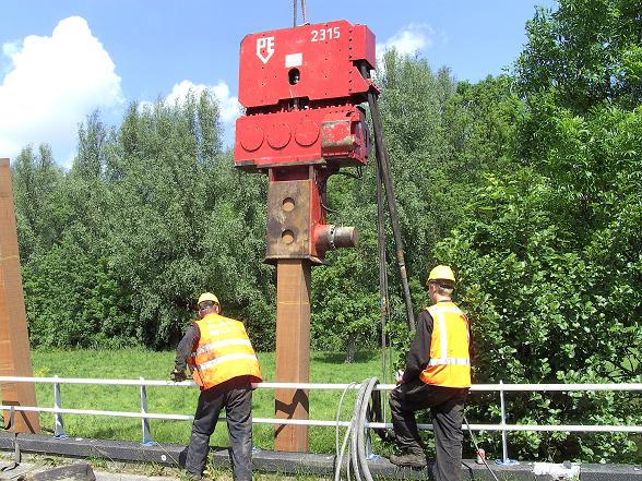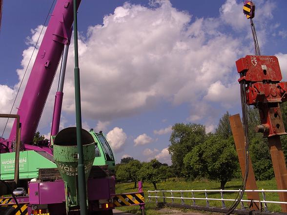 Door middel van een kraan uitgerust met een trilblok werden de oude palen de bodem uitgetrild. De nieuwe palen werden door het trilblok de bodem ingetrild.