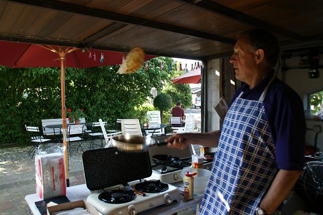 Er werden ook overheerlijke pannenkoeken gebakken. Dhr. de Jonge draaide op een spectaculaire manier de pannenkoeken om.