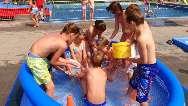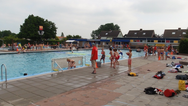 Geplaatst op:02-07-2009 Bijgewerkt op:02-07-2009 16:43 De Hobbitstee start het zwemfestijn in Het KnopenbadBron: Geo van Heijningen, O.B.S. De HobbitsteeIn de jaren tachtig van de vorige eeuw werd een aantal jaren een zwemochtend georganiseerd waaraan alle scholen met een afvaardiging meededen.Dit jaar heeft “Stichting Behoud Zwembad” samen met Stichtingsbestuur van het Knopenbad voor het eerst het initiatief genomen om een zwemfestijn voor de basisscholen te organiseren. Alle kinderen van groep 3 tot en met 8 van iedere school waren uitgenodigd om een ochtend naar het zwembad te komen. De Hobbitstee mocht het spits afbijten op woensdag 1 juli. Meer dan 175 kinderen gingen lopend in een lange optocht naar het zwembad. Daar stonden heel veel spelletjes klaar. Ruim twintig ouders hielpen bij de verschillende onderdelen. Fré Doop, oud-leerkracht van De Hobbitstee, leidde de ochtend op zijn alom bekende enthousiaste manier. Het weer was fantastisch en de kinderen hadden er veel zin in. Dus alle ingrediënten om het festijn te laten slagen. Om 12.00 uur ging iedereen, met een krentenbol van de organisatie, moe maar voldaan naar school terug.