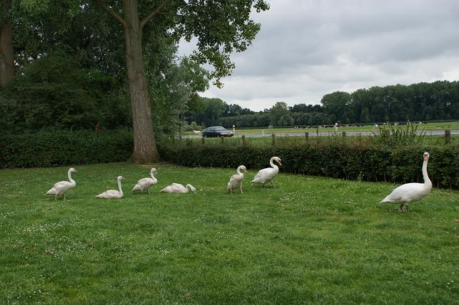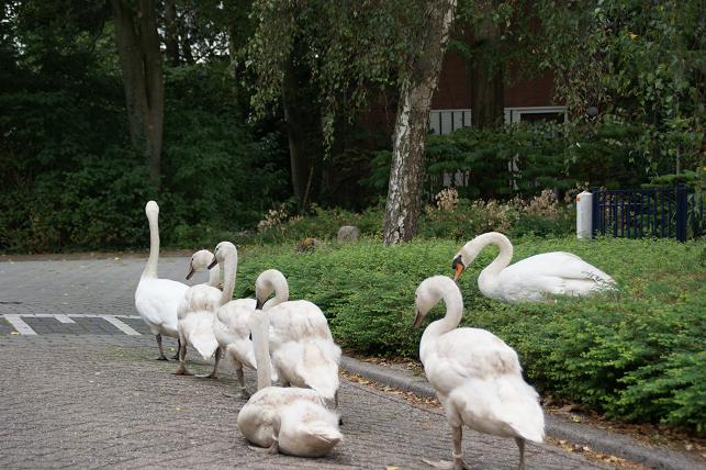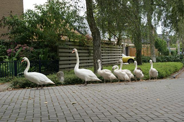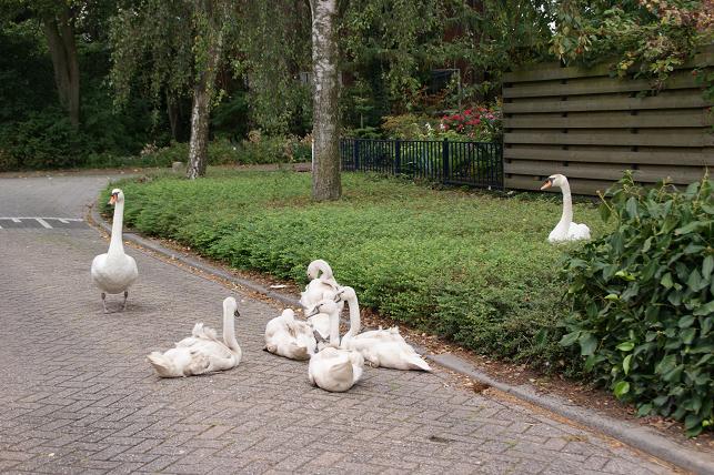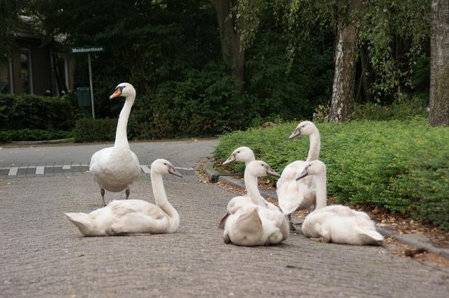 Zaterdag 8 augustus nam een zwanenfamilie de Berkenlaan in Linschoten in beslag.