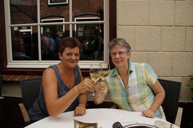Op de jaarmarkt kom je veel bekenden tegen en is het tijd om eens bij te praten. Deze dames doen dit onder het genot van een wijntje.