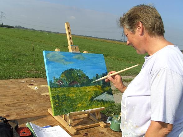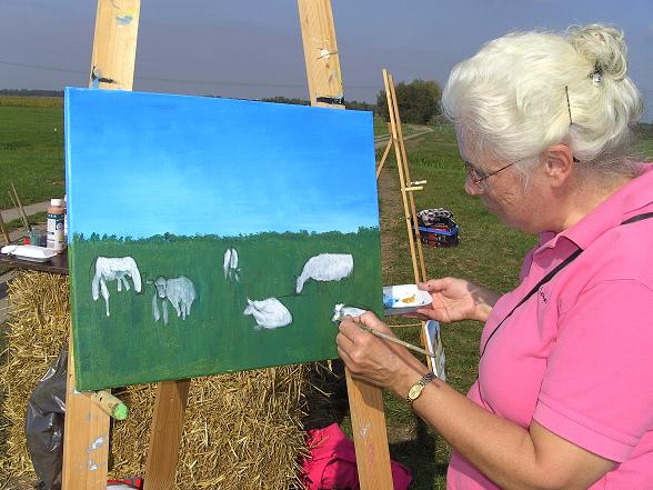 Onder begeleiding van José van den Helder gingen de deelnemers in het weiland aan de slag om de koeien op het witte doek vast te leggen. Na alle inspanning van het schilderen konden zij aanschuiven voor een heerlijke lunch.