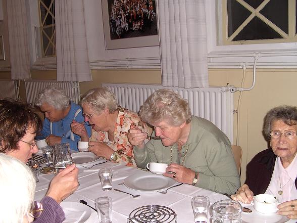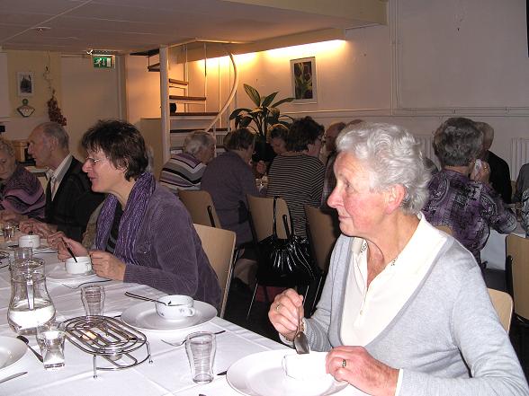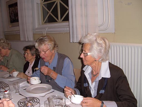 Gezellig met z’n allen aan lange tafels genieten van de ouderwetse Hollandse pot, bestaande uit een heldere bouillonsoep, verschillende stamppotten en als toetje heerlijke stoofperenvla.