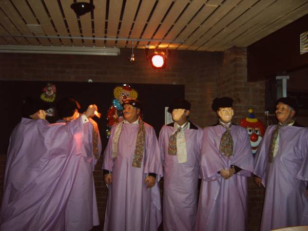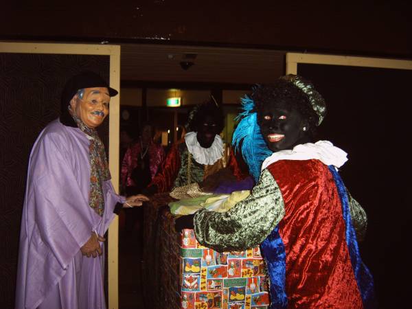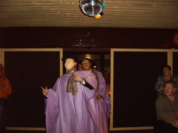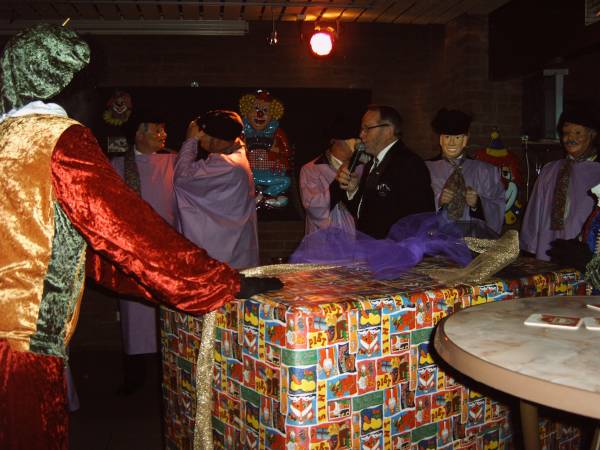 In de zaal heerste een gezellige spanning vol nieuwsgierige wat er gebeuren zou. Als eerste kwamen er twee zwarte pieten binnen die iedereen deed verrassen met hun bezoek, toen kwamen er onherkenbaar door een paars gewaad en met masker op de raad naar binnen.