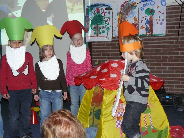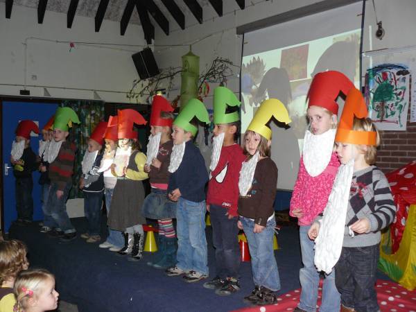 Ze hebben aan leerlingen, ouders en familie getoond waar ze de afgelopen drie weken in de klas mee bezig zijn geweest. Omgetoverd tot kabouters namen ze hen mee op zoek naar een huisje voor kabouter Pim. Middels liedjes,kriebelspelletjes, versjes en natuurlijk de kabouterdans vertelden ze hun verhaal. Foto's van al hun bezigheden in de klas vormden samen met hun eigengemaakte werkstukken het decor en completeerde de voorstelling.
