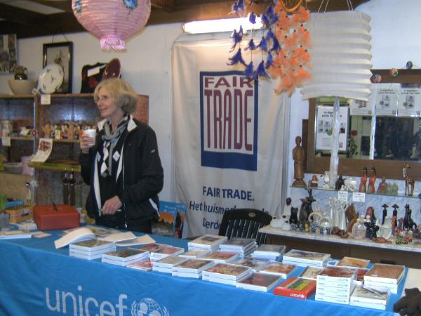 Mevr. Postema stond namens Unicef met kalenders, wenskaarten, puzzels en cadeautjes voor kinderen.