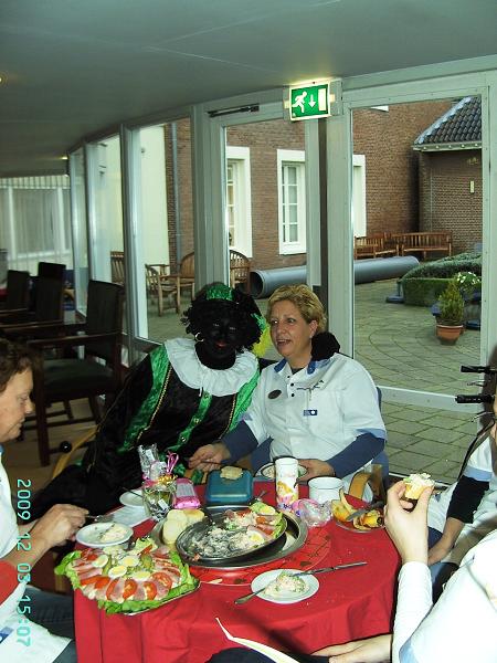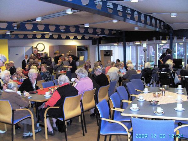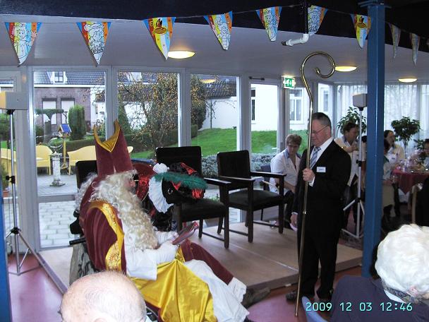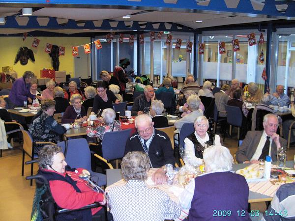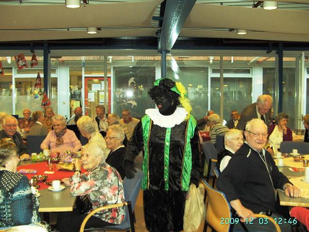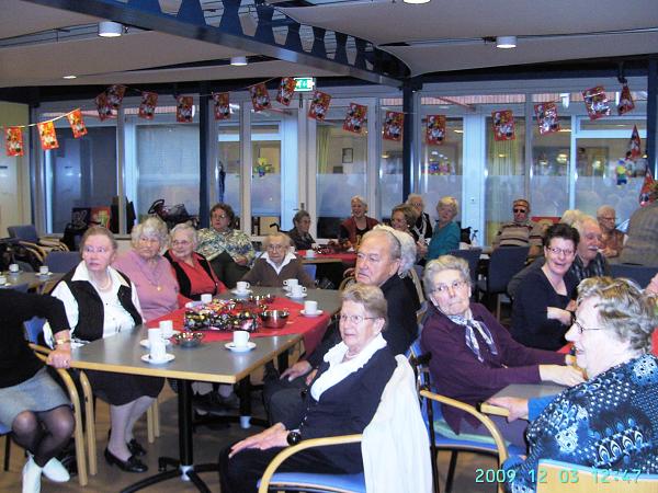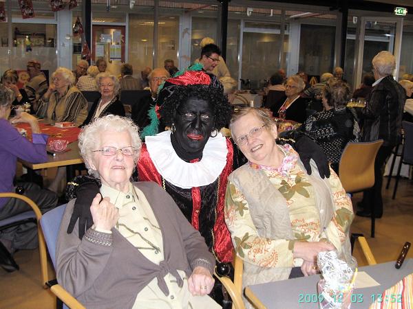 Na het kopje koffie met wat lekkers erbij kwamen Sinterklaas en zijn twee pieten onder het zingen van ‘Sinterklaasje kom maar binnen met je knecht’ de zaal ingereden met een rolstoel.