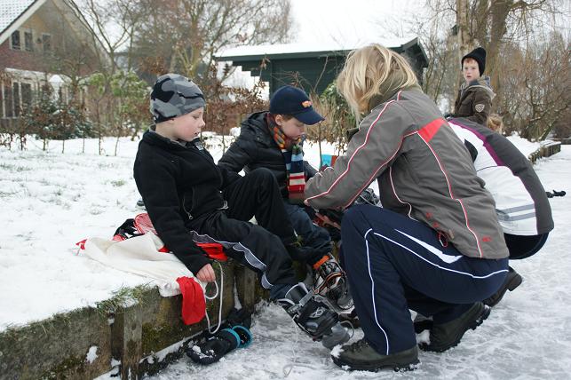De juf heeft handenvol werk met het helpen aantrekken van de schaatsen.