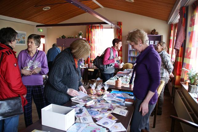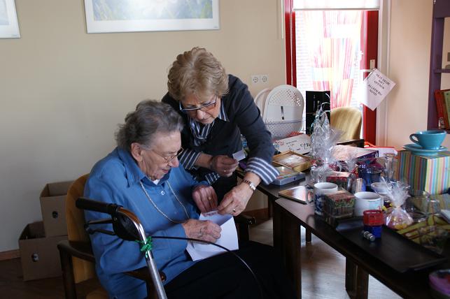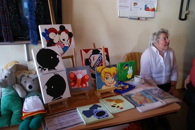 Deze dag vond er een verkoping plaats, allemaal zelfgemaakte spulletjes zoals kettingen, schilderijen, wollen sokken, knuffels, geborduurde kleedjes, gemaakt door diverse mensen o.a. bewoners van De Lindescote.