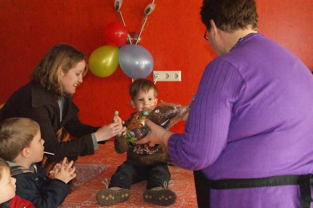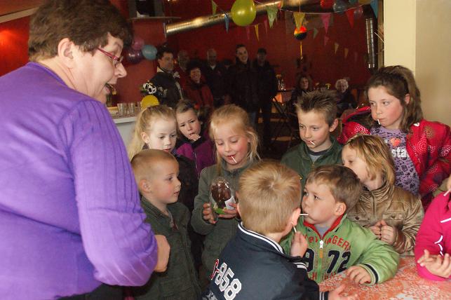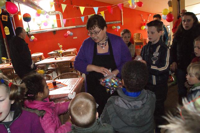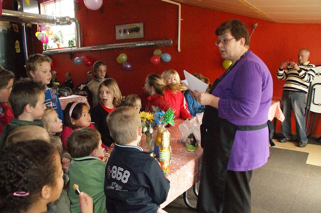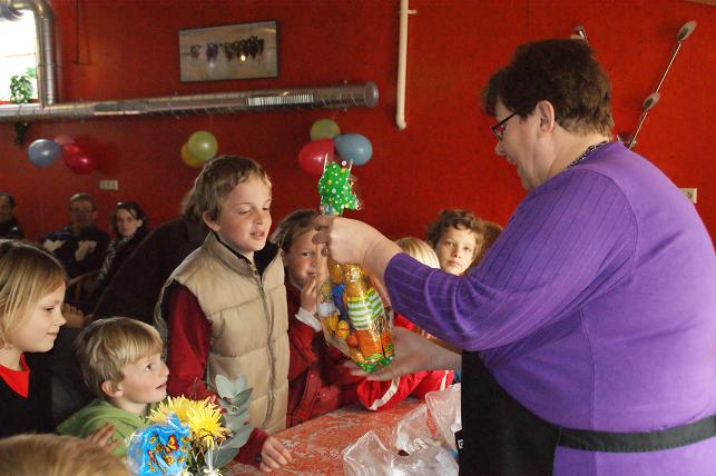 | Als laatste volgde de prijsuitreiking. De drie kinderen die de meeste eitjes hadden gevonden kregen een leuke chocoladeprijs, de andere kinderen kregen een zakje met paaseitjes mee naar huis.