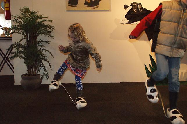 | Ondertussen vermaakten de kinderen zich met de vele spelletjes zoals: koeien melken, vier op een rij en sjoelen. En op klompen lopen die aan elkaar vast zitten, dat is als je klein bent toch niet zo makkelijk.