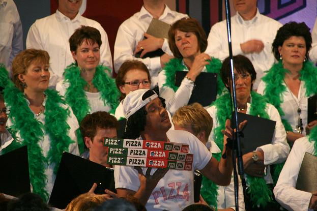 Direct na het vrolijk gezongen Pasta kwam een plaatselijke pizzabakker (Cock Verkerk) met zijn bestelfiets de kerk binnen gereden om de bestelde pizza’s af te leveren terwijl het publiek vrolijk het pizzalied van André van Duin ‘Effe wachten’ meezong. Dat was een prima opmaat voor het publiek om ook mee te zingen met La donna e mobile uit Verdi’s opera Rigoletto, het laatste lied voor de pauze.