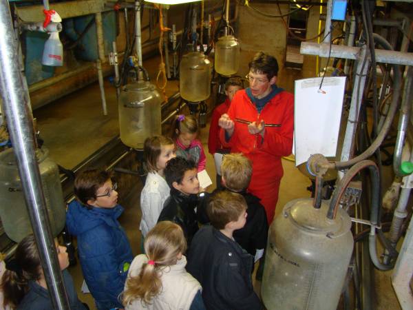 Ze leerden daar blaaskop- en roodbonte koeien te herkennen. Na een uitgebreid kijkje in de stal nam de boerin de kinderen mee naar de melkplaats. De kinderen voelden hoe de spenen om de uiers van de koe zitten en hoe de melk naar de tank gaat. Ook mochten de kinderen het melken met de hand uitproberen, dit lukte alle kinderen!