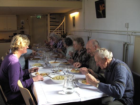 Jong en oud waren door de SWOM uitgenodigd om maandag 19 april aan te schuiven voor een Italiaanse maaltijd in Bij de Tol te Linschoten.