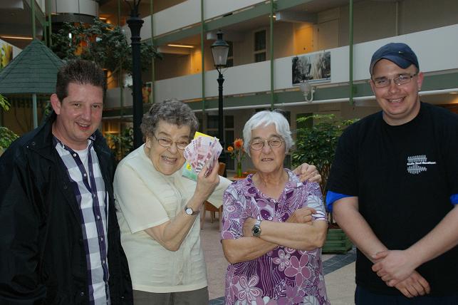 Het team van de 'Radiobingo' met in hun midden de trotse winnares (links) mevr. van de Bosch en haar grote vriendin Bep. Hartelijk gefeliciteerd!