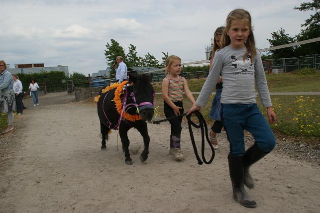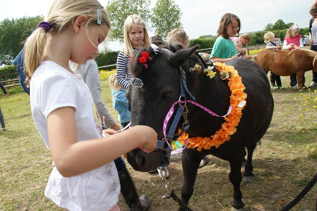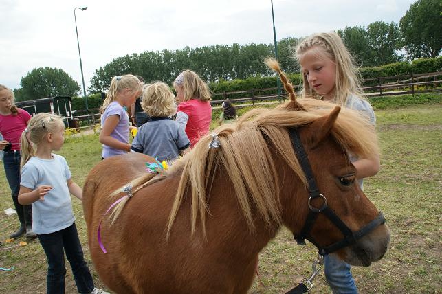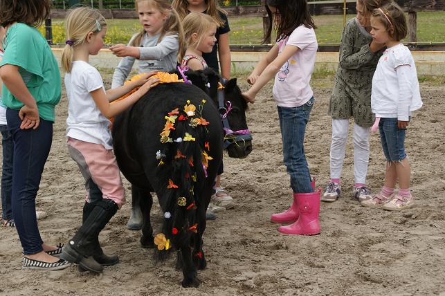De bezoekertjes gingen in groepjes aan de slag en de pony’s werden vanaf hun hoofd tot aan het puntje van de staart opgepimpt met strikjes, speldjes, bloemenkransen, de manen en staarten werden voorzien van vlechtjes.