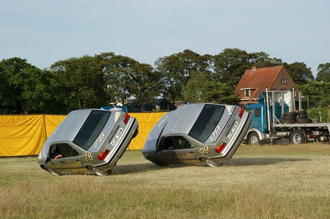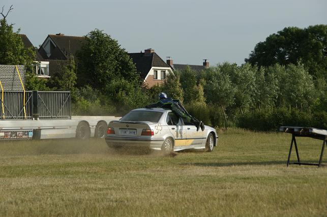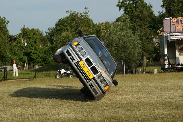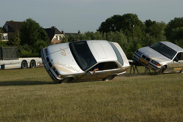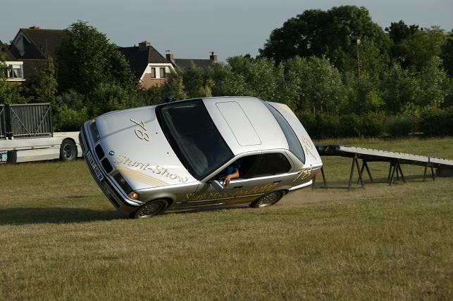 Via een schans de auto op twee wielen laten rijden.