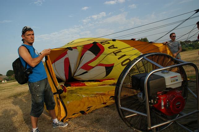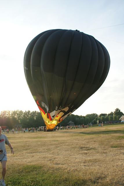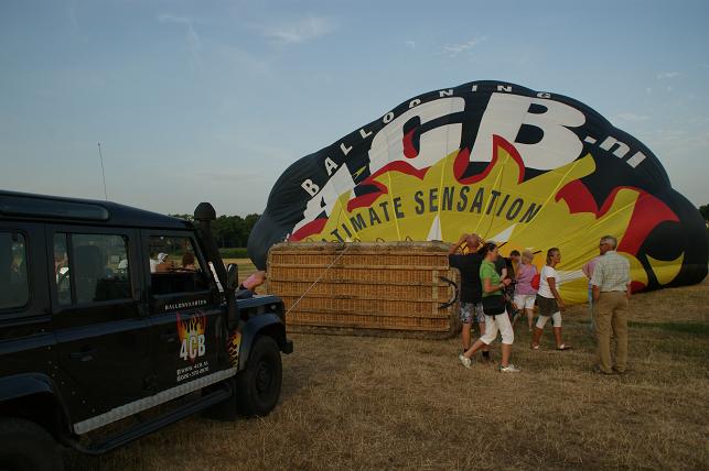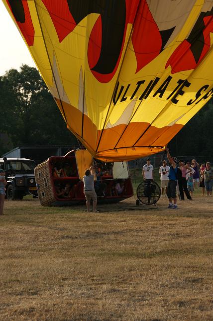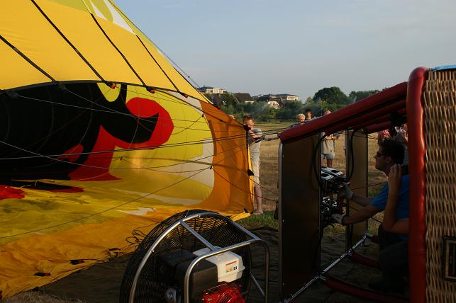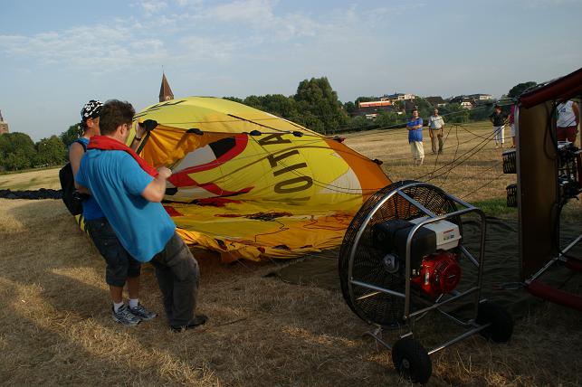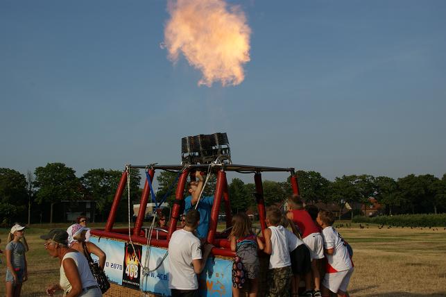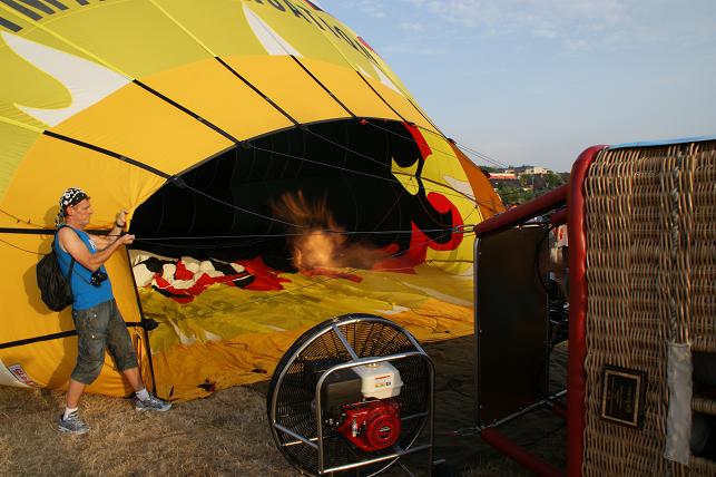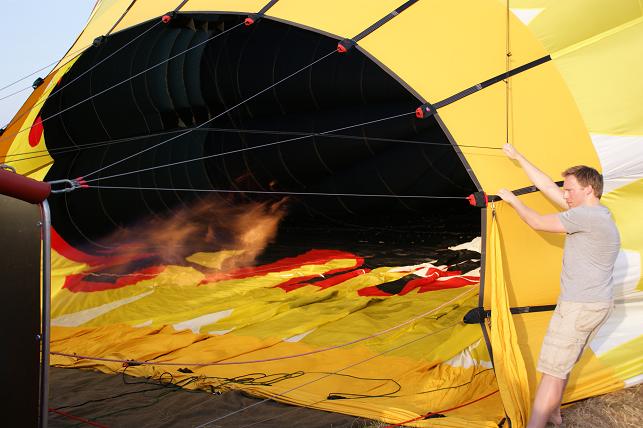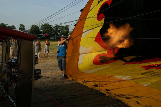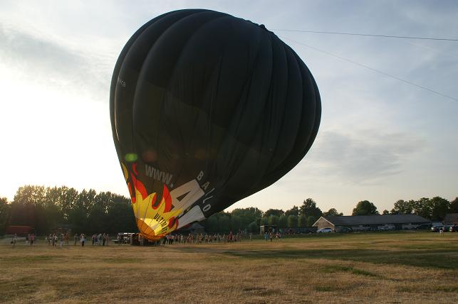 De branders worden aangezet en de hete lucht wordt de ballon ingeblazen.