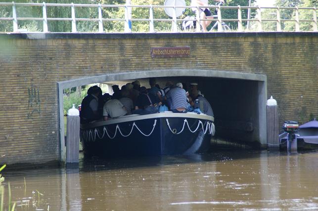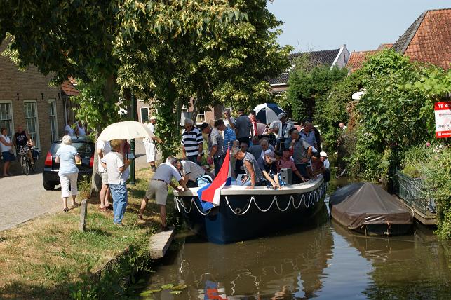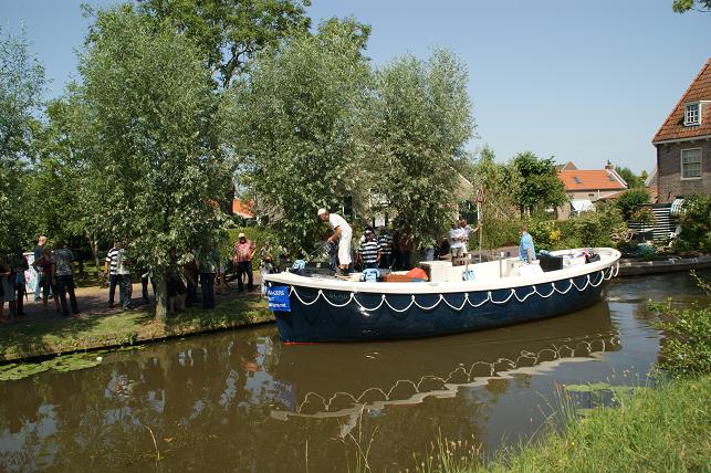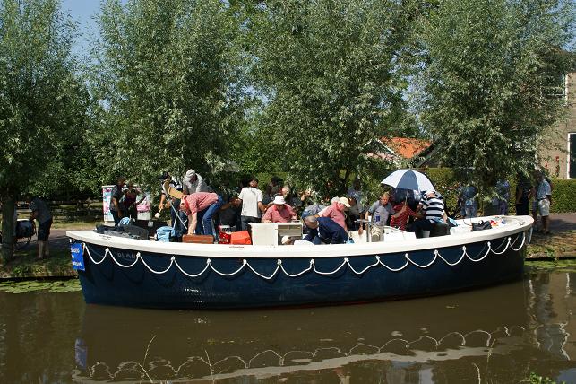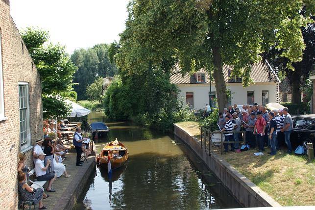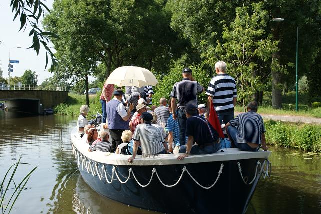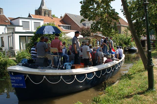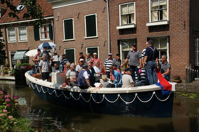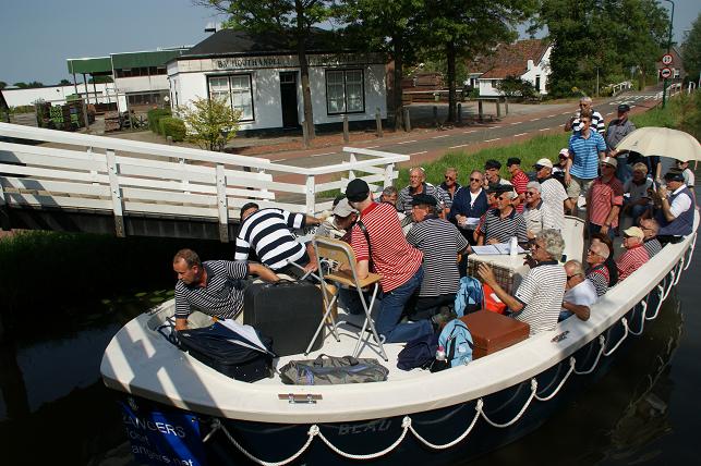 Op de Vaartkade Z.Z. gingen de zangers even van boord zodat de schipper rustig kon manoeuvreren met de brede sloep door de voor hem smalle doorgang.