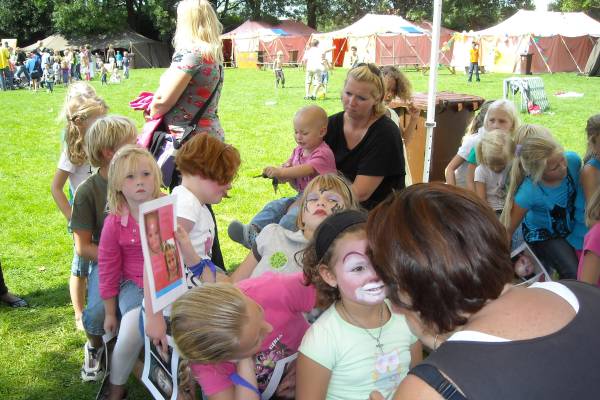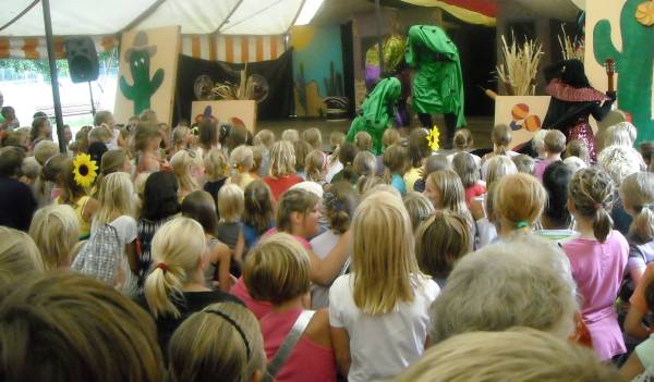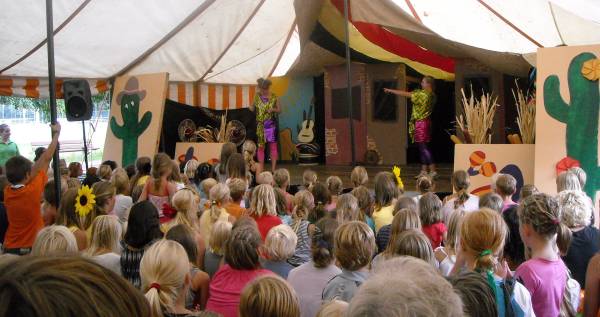 In de grote tent speelt iedere dag een stukje van het themaverhaal.