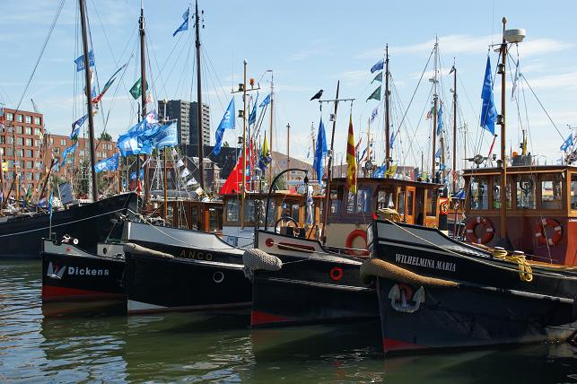 Er zijn vele soorten schepen te bewonderen, zoals het varend erfgoed op de bovenstaande foto. O.a. sleepboten, zalmschouwen, en binnenvaartschepen.