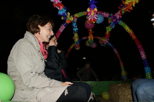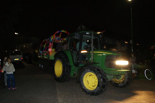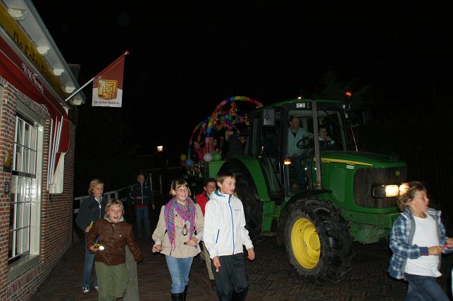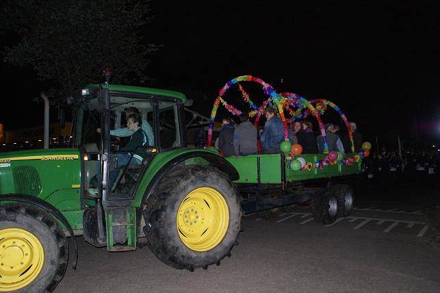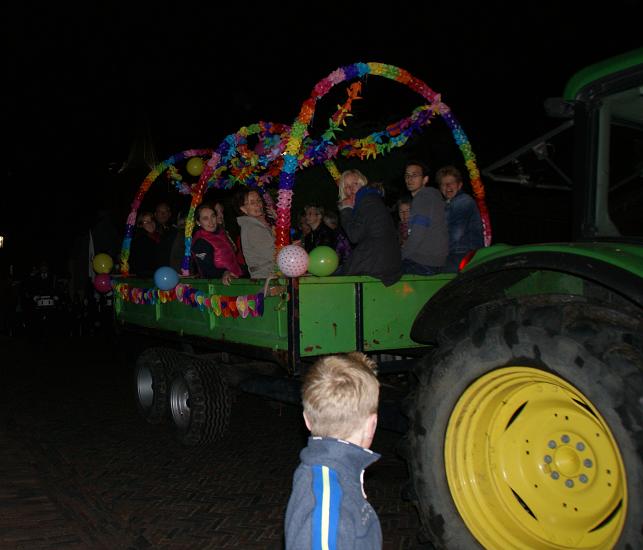 Er stond een tractor met een mooie versierde kar klaar waarin de docenten plaats mochten nemen voor een rondrit door Linschoten op weg naar De Brede Vaart, gevolgd door muziekvereniging Linfano en de kinderen.