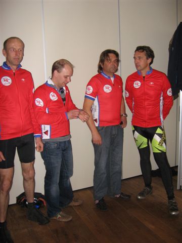 Geplaatst op:03-11-2010 Bijgewerkt op:03-11-2010 21:07 RTC Montfoort sluit toerseizoen 2010 afBron: Bernadette de Vos-HarmsTraditioneel sluit de RTC Montfoort op de laatse zondag van oktober het toerseizoen op de weg af met de zogenaamde snertrit. Door het toch wat regenachtige weer vertrok op zondag 31 oktober om 09.00 uur slechts een klein gezelschap fietsers vanaf de Plaats om, na een tocht van circa 75 kilometer, via Loosdrecht en Breukelen, om 12.00 uur te arriveren in café-petit restaurant "De Posthoorn" in Achthoven. Vrijwel tegelijkertijd arriveerde er ook een aantal RTC-ers voor wie het "winterwerk" al begonnen is. Zij hadden een mountainbiketocht in Driebergen achter de rug. Tijdens het eten van de snert werd het afgelopen seizoen doorgelopen en kon al begonnen worden met de voorbereiding van het nieuwe seizoen 2011. Die voorbereiding bestond uit het uitdelen van de nieuwe kleding voor de leden. Mede dankzij de financiële steun van een aantal sponsoren zullen de RTC-ers vanaf nu in een nieuwe outfit kunnen fietsen. Daar waar nu de huidige kleding overwegend blauw is, is de hoofdkleur van de nieuwe kleding overwegend rood. De kleding werd door de aanwezige leden met veel enthousiasme ontvangen.