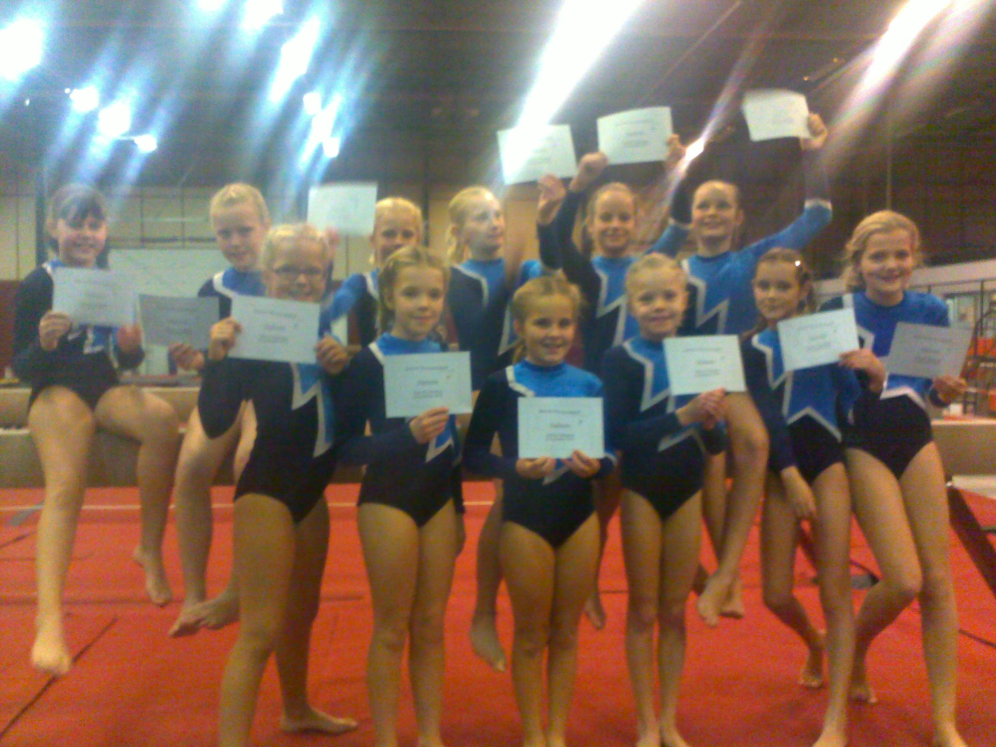 Geplaatst op:08-11-2010 Bijgewerkt op:08-11-2010 18:15 ONI Montfoort naar mini 3/4 kamp in AmerfoortBron: Anchel KraanDe mini ¾ kamp is een gymwedstrijd voor recreanten van verschillende leeftijden en verschillende gymverenigingen in het rayon Midden Nederland. De turnsters strijden in ploegen van 6 en turnen op verschillende toestellen. De 3-kamp bestaat uit lange mat, brug en balk. En de 4-kamp bestaat uit één toestel extra de mini trampoline. In de 1e ronde begon het een beetje stroef, maar de oudste recreanten Laura Kooijman, Michelle den Hartog, Iris Dorrestein en Anne Lekkerkerker mochten de spits afbijten. Ondanks dat zij geen warming up hadden hebben zij toch een goede prestatie neergezet. Met een totaalscore van 156.20 punten behaalde zij een mooie 5e plaats. In de 2e ronde kwamen de jongste recreanten van de 3-kamp in actie. Nadine de Vries, Julie de Vries, Amy van Vliet, Danique van Leeuwen en Melanie van de Berg startten op de evenwichtsbalk. Door de zenuwen vergaten zij een paar elementen, maar ondanks dat zijn zij met een totaalscore van 122.40 punten 3e geworden!! De meiden waren erg verrast en hebben hiermee een plekje in de finale verdient! De 3e ronde startten 6 turnsters uit ONI meisjes groep 3 (Desiree de Krijger, Eefje Wigberd, Anouk de Reuver, Gwen Breuer, Lynn Arents en Michelle de Ruiter) in de 3-kamp. Ook zij startten op de moeilijke evenwichtsbalk. Zij hebben mooie oefeningen laten zien, maar vielen helaas net buiten de prijzen. Met een totaalscore van 116.00 punten zijn zij 4e geworden. Het kan net voldoende zijn om aan de finale mee te doen. Senna Benschop, Melanie de Jong, Dionne van Lint, Esmee van der Lingen, Isa Kamer en Michelle Buijs startten in de laatste ronde in de 4-kamp. Zij mochten bij hun favoriete toestel beginnen: de mini trampoline. Na een hele nette oefening en veel plezier hebben ook deze meiden een topprestatie neer gezet! Met een totaalscore van 164.60 punten hebben zij een hele mooie en verdiende 2e plaats gehaald! Zij zijn zeker van een plekje in de finale! De trainsters zijn erg trots op al deze meiden die mee hebben gedaan! Zij hebben allemaal een top prestatie neer weten te zetten!!