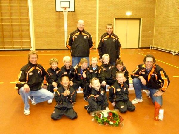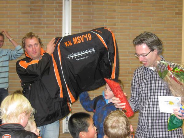 Geplaatst op:06-01-2011 Bijgewerkt op:06-01-2011 10:08 MSV '19 F4 in het nieuwBron: Linda van den HaselkampOp 11 december was het zover, de F4 van MSV '19 kon de gesponsorde kleding in ontvangst nemen. Jacco van Lint (de vader van Casper) van De Groen & Van Lint Advocaten heeft de spelers van mooie trainingspakken voorzien en de trainers en leiders kregen een waterdicht jack voor langs de lijn. De spelers Casper, Casper, Daan, Joël, Jop, Menno, Sam, Sem en Thijn zijn erg blij met de pakken. Dit zal hen zeker helpen de koppositie van de najaarscompetitie vast te houden! Namens de F4 en MSV '19 wordt Jacco bedankt door André van de Brink met een flesje wijn en bloemen.