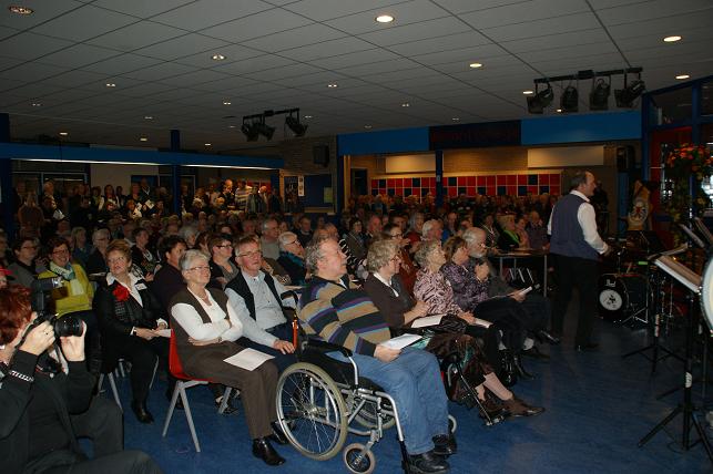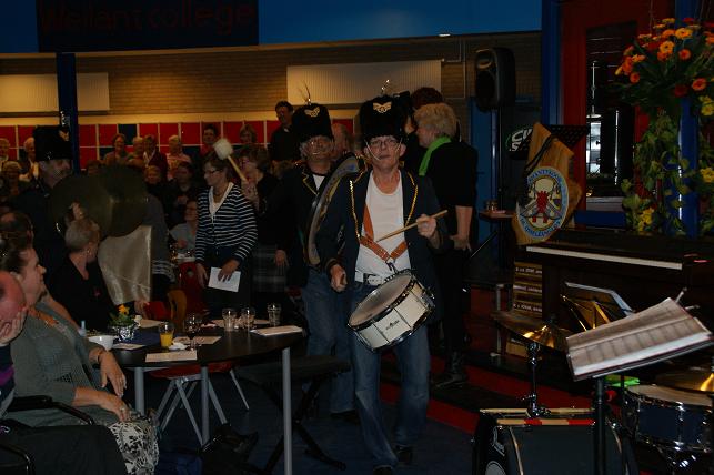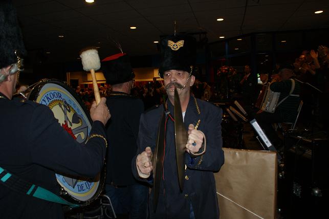 Geheel onverwacht liep van achter uit de zaal een vierkoppig IJsselzangers-fanfarekorpsje tussen het publiek door op weg naar het podium.