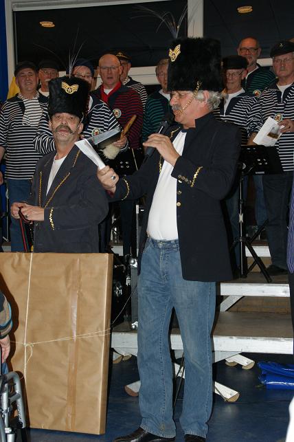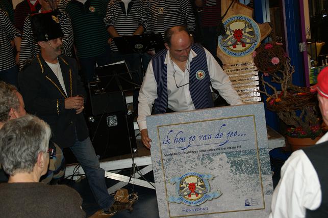 Daar overhandigden zij aan de dirigent van De IJsselzangers hun nieuwe cd, bijgestaan door een mooie beamerpresentatie met beelden van het Shantykoor. Zij zongen enkele liederen van hun nieuwe cd.