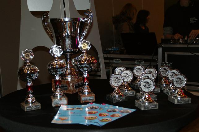 De bokalen waar de verschillende carnavalsverenigingen kans op maakten met de zeskamp.