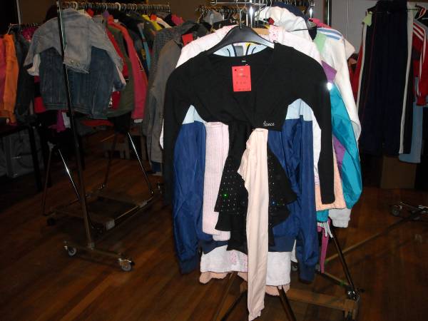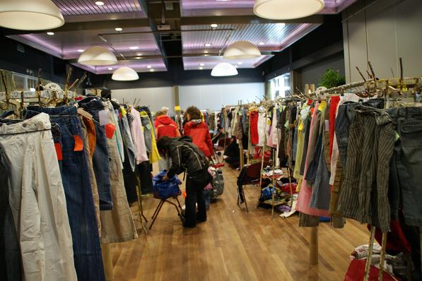 De kwaliteitskleding, vaak van dure merken, werd op maat en model gesorteerd op lange rekken en tafels.