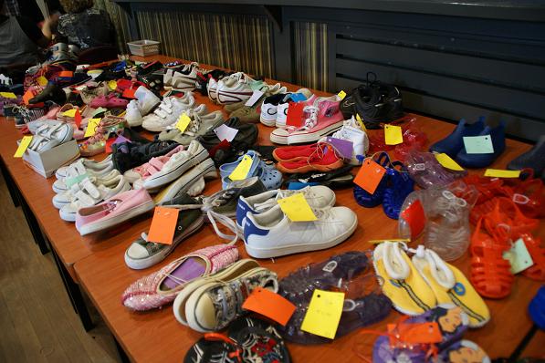 Enkele tafels gevuld met schoenen.