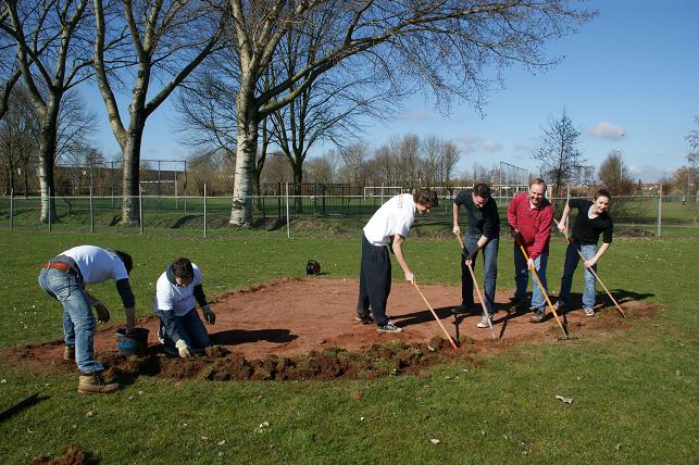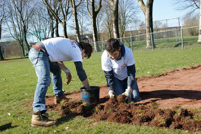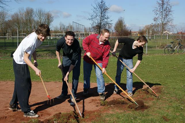 Onder het genot van de lentezon staken zij hun handen en groene vingers uit de mouwen om het veld speelklaar te maken.